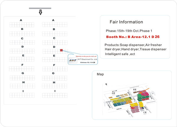 You will see various kinds of Soap dispenser , Fragance Dispenser, Hand Dryer, Hair Dryer, Hotel Safe, Tissue Dispenser with high-tech & new style in our booth. For our product detail, please visit our web www.aytcn.com .