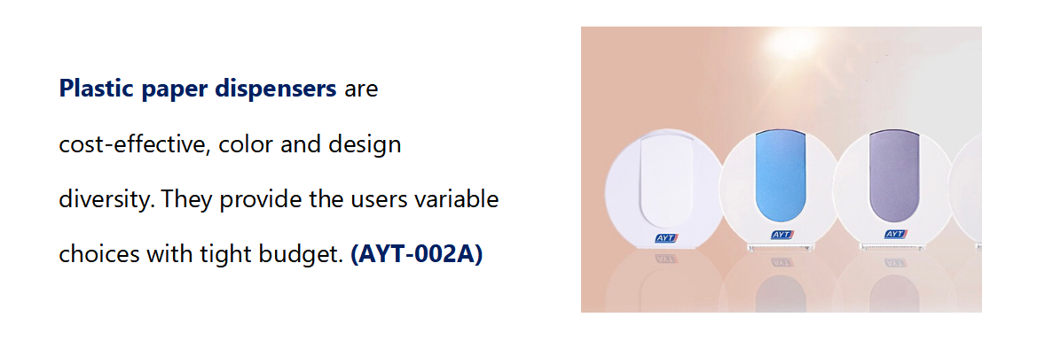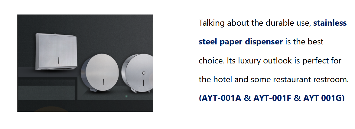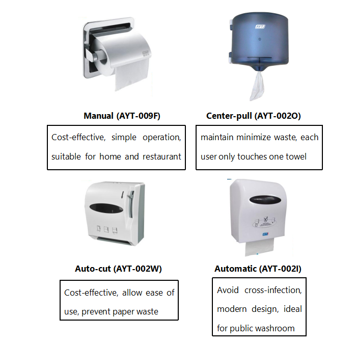 When you consider about the type of paper dispenser, do not forget to choose the right type of paper which will be dispensing. Paper towel include small toilet roll, jumbo roll and multi-fold paper. Make sure to check what kind of towel refill is ideal for your dispenser. Small Toilet Roll Paper Dispenser (AYT-009D & AYT-009F)