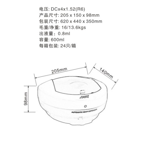 | Automatic soap dispenser | 600ml | 0.75 | 50k | 205*150*98 | 620*440*350 | 24 | 16 | 13.6 |