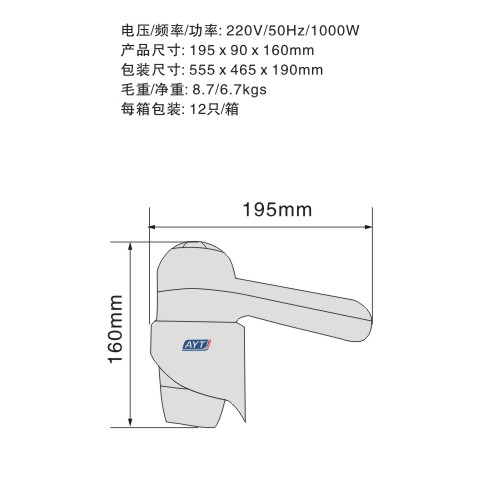 Wall mounted hair dryer: 1000W