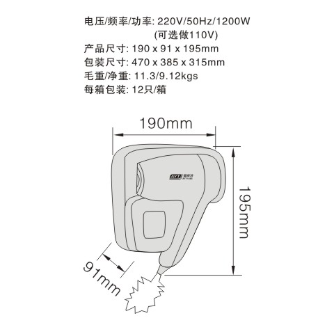 Wall mounted hair dryer: 1200W